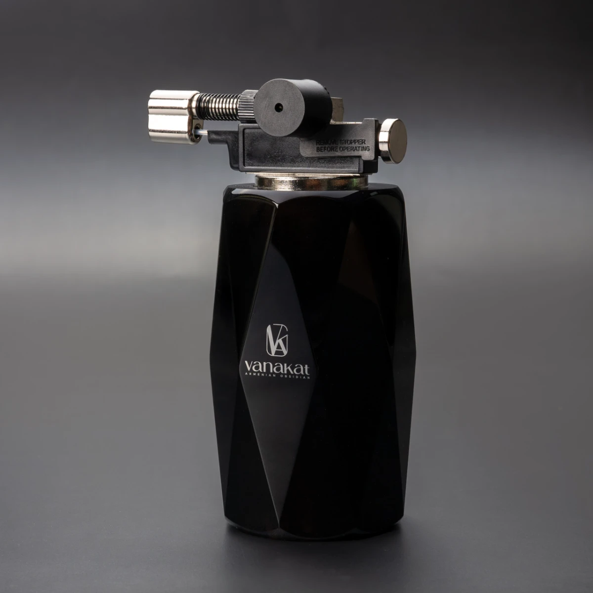 A faceted Jet Black obsidian body — cut with the same geometric precision as a gemstone, mirror-polished across every face — carries a single jet butane torch mechanism at its crown. The torch is a single jet butane.